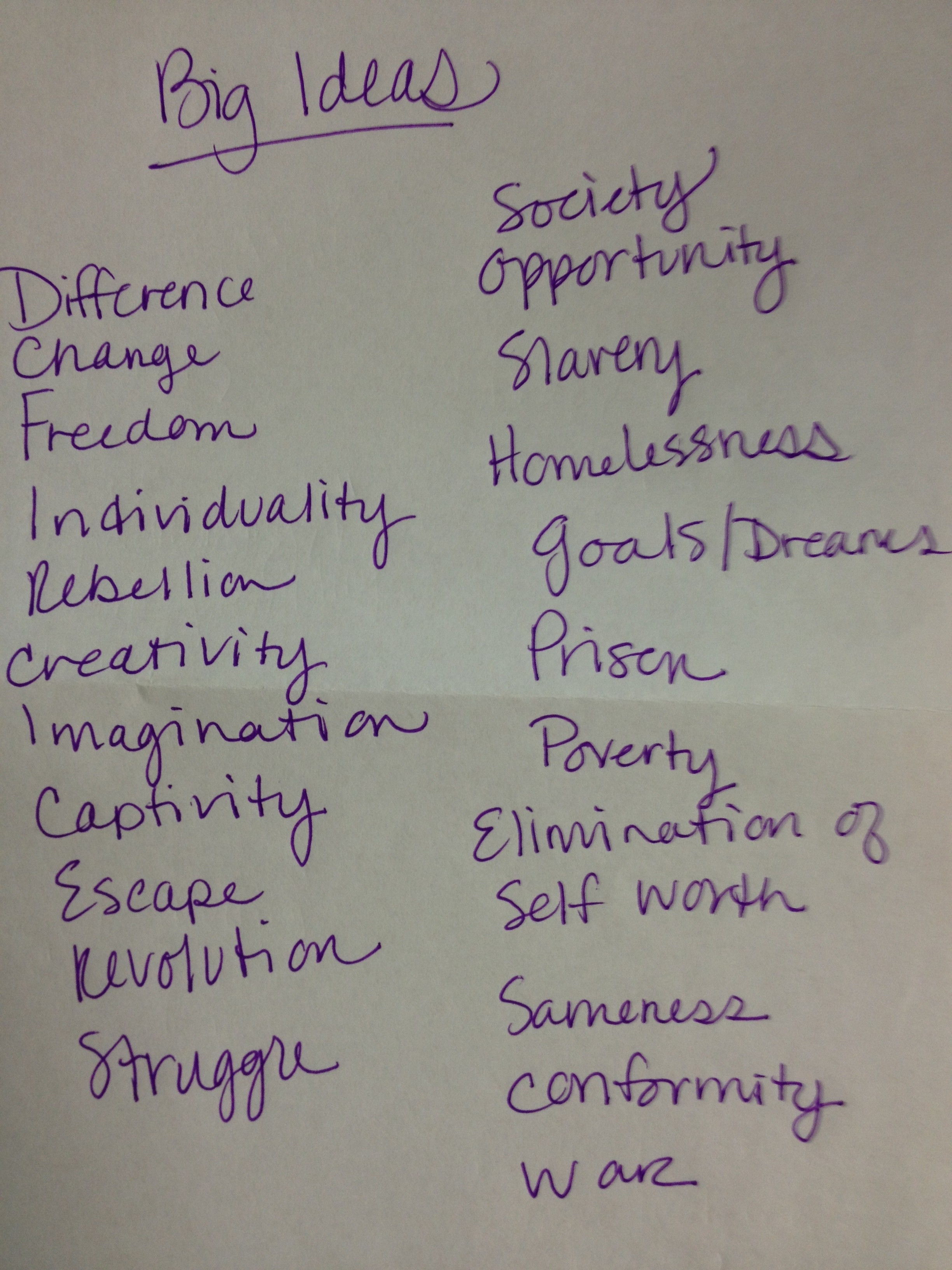 I usually introduce themes to students as topics (or “big ideas” if you prefer) plus an opinion about that topic. Here are some of the “big ideas” or topics students were able to come up with using this strategy: