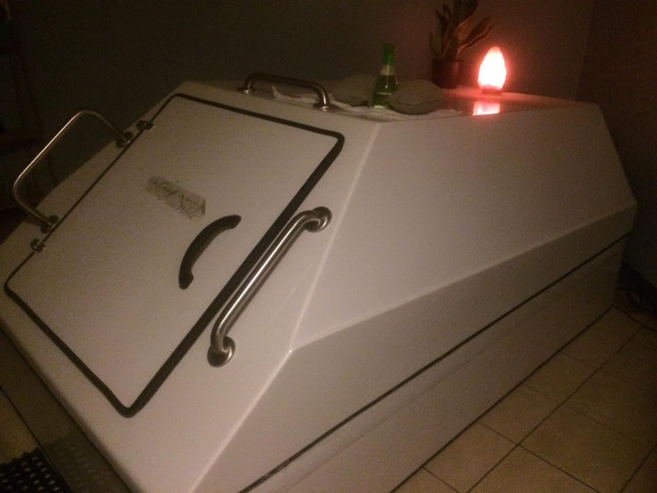 Now, most spas that use them call them “float tanks.” I would say this is a far more accurate description of the experience: floating weightlessly, timelessly in empty space. Probably the closest I will ever get to being in actual space, which is sort of what it feels like. In a float tank, you are shut off to sound and light, and there is body-temperature water saturated with epsom salt in the bottom of the tank. The salt makes you buoyant- to the point that you can literally nap in the tank with no worries. Because of the temperature of the water, there is the sensation of “floating” in nothingness. Here are some pictures of the tank.