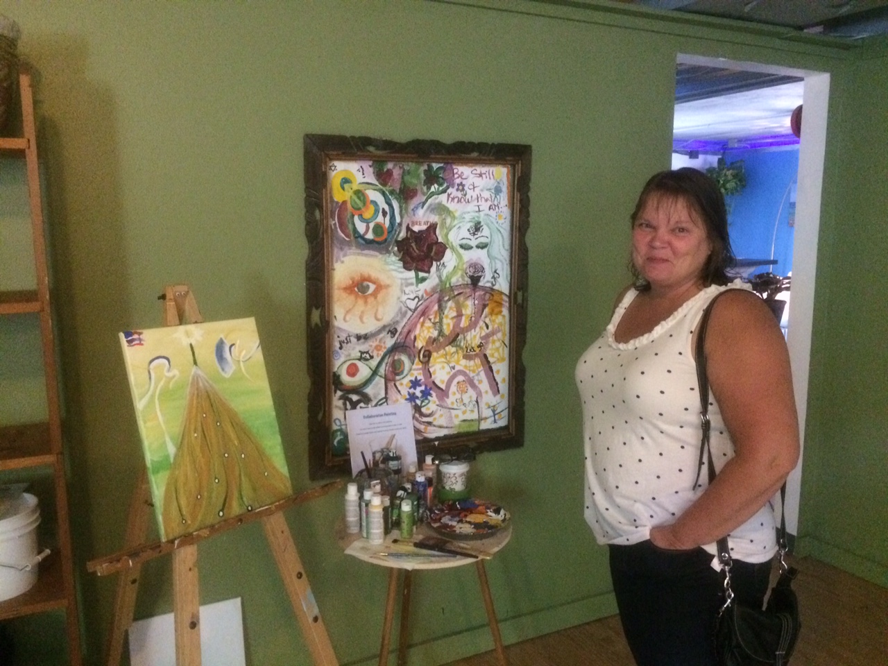 After floating, guests are encouraged to add to the collaborative art piece in process, which I decided to do afterward. I can’t say the piece was one of creative genius, but it was really fun to do. My mom decided not to paint, but was gracious enough to pose with the work in progress.