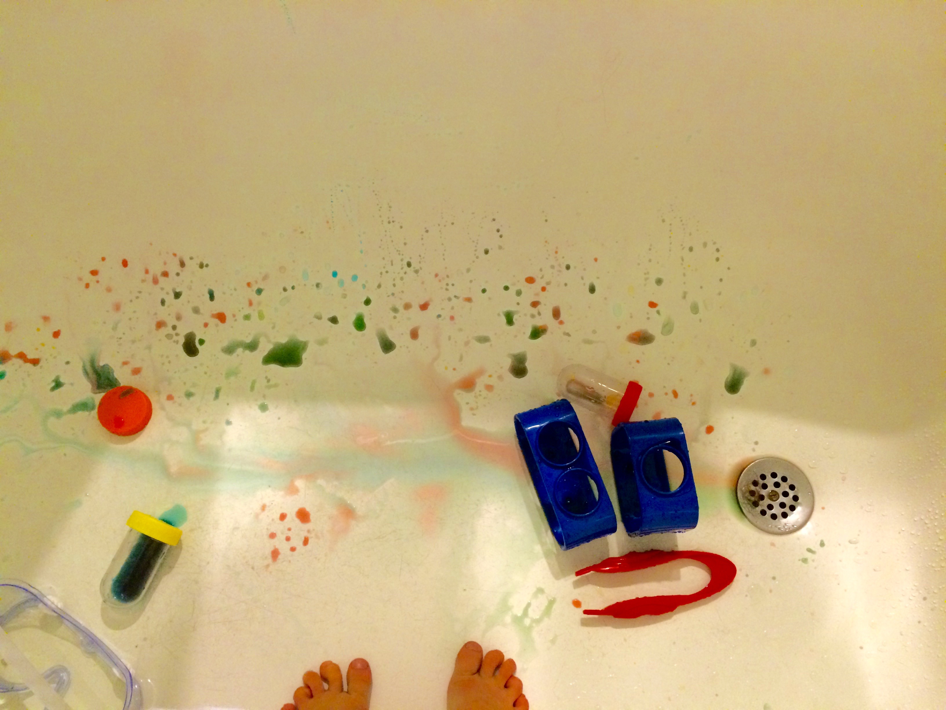 A few weeks ago, he ordered a science kit online and one of the projects was to blend colored water in test tubes. He sat in the bathtub and made his science project into an artistic expression- a temporary rainbow.