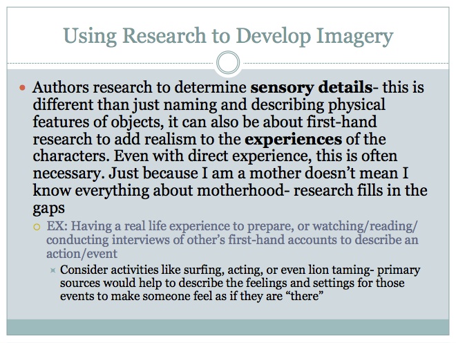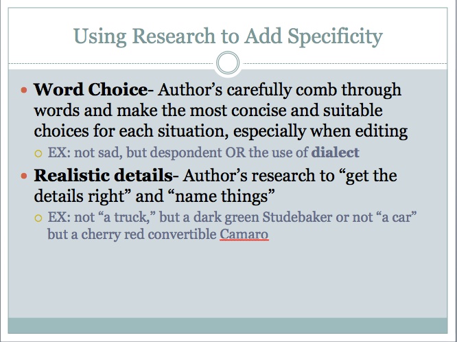 - I can identify the types of purposes (to add specificity, develop metaphors, and enhance imagery) for which an author might use research.
